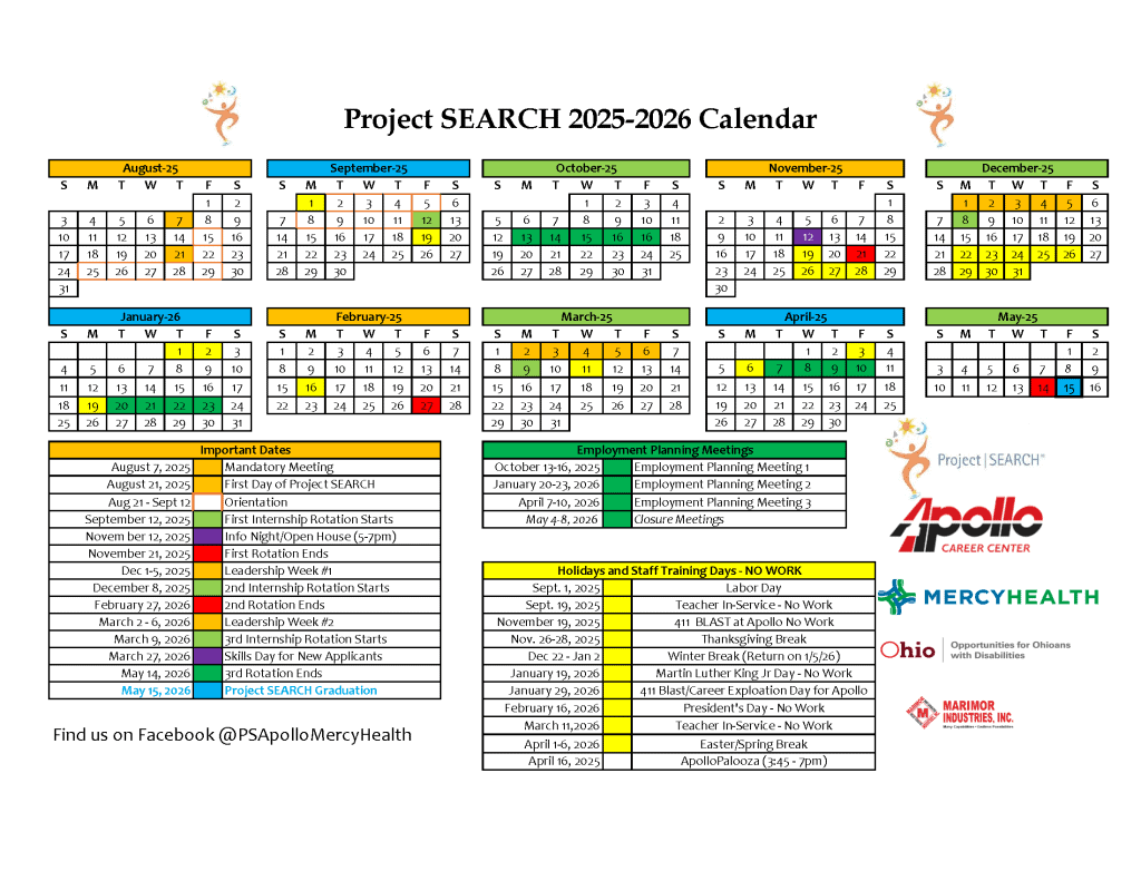 - The Project SEARCH calendar follows the Apollo Career Center calendar for holidays, weather delays, and closings. There are items on the Project SEARCH calendar that Apollo does not participate in and there are events that Project SEARCH will not participate in at Apollo.