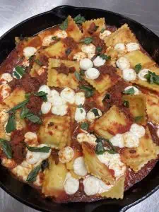 Add tomatoes and basil, bring to a simmer. Fold in the ravioli and half the mozzarella pearls.