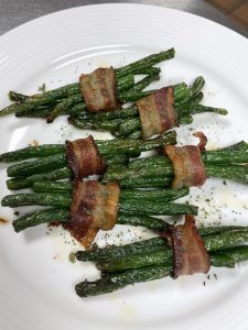 Wrap 8-10 green beans with a piece of bacon and secure with a toothpick. Place the green bean