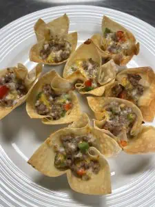 Place wonton wraps in a muffin pan and bake at 350 degrees F for 5-10 minutes until they are