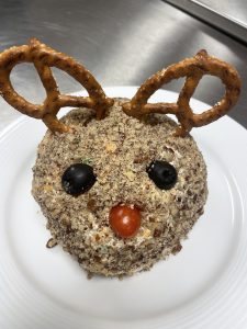 Black olive for eyes, tomato for nose, 2 pretzels for antlers