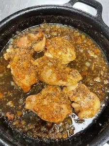 Arrange chicken on a serving plate and drizzle liquid from the pan on top.